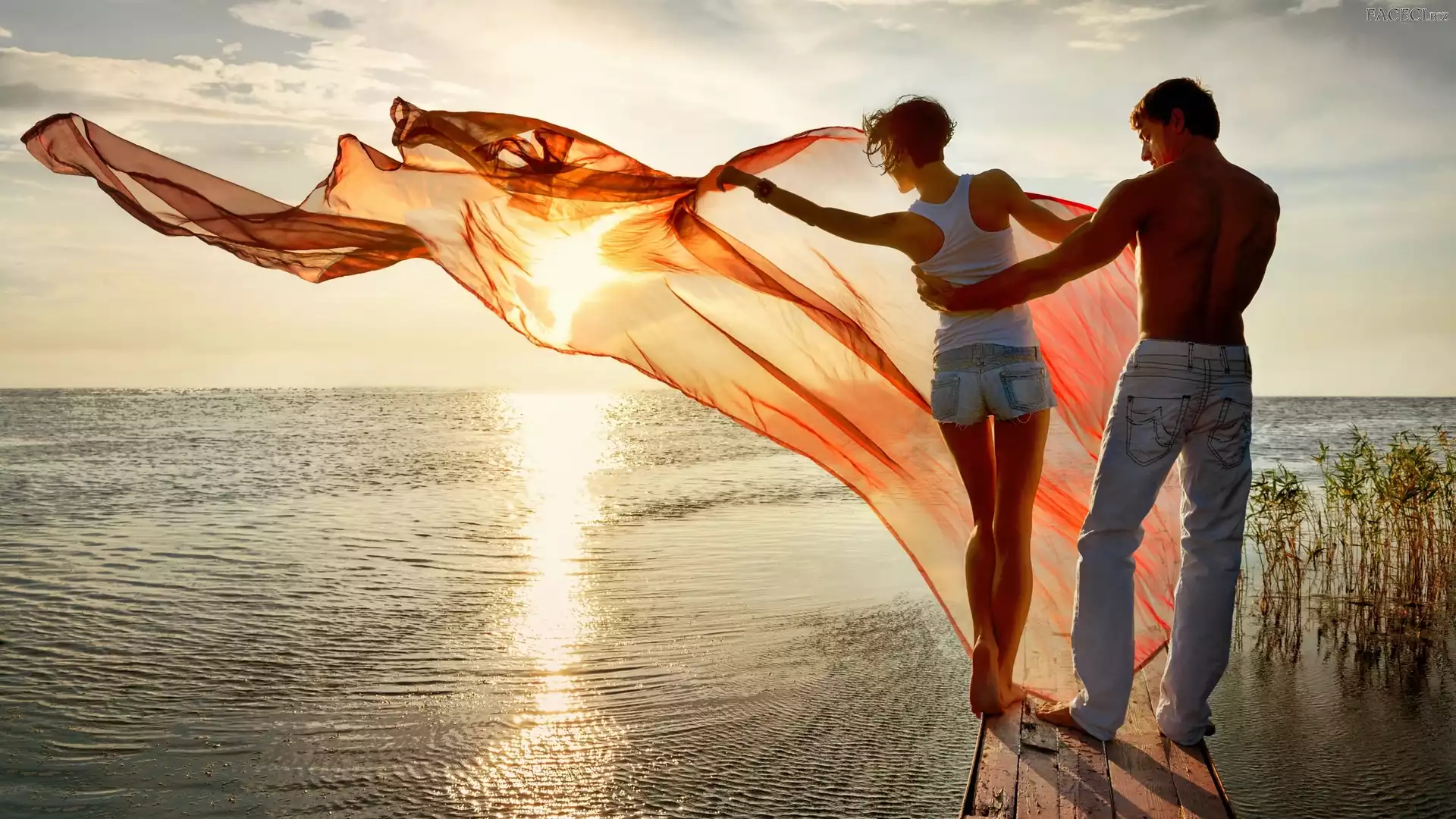 Zachód słońca, Pomost, Mężczyzna, Kobieta, Jezioro - faceci.biz